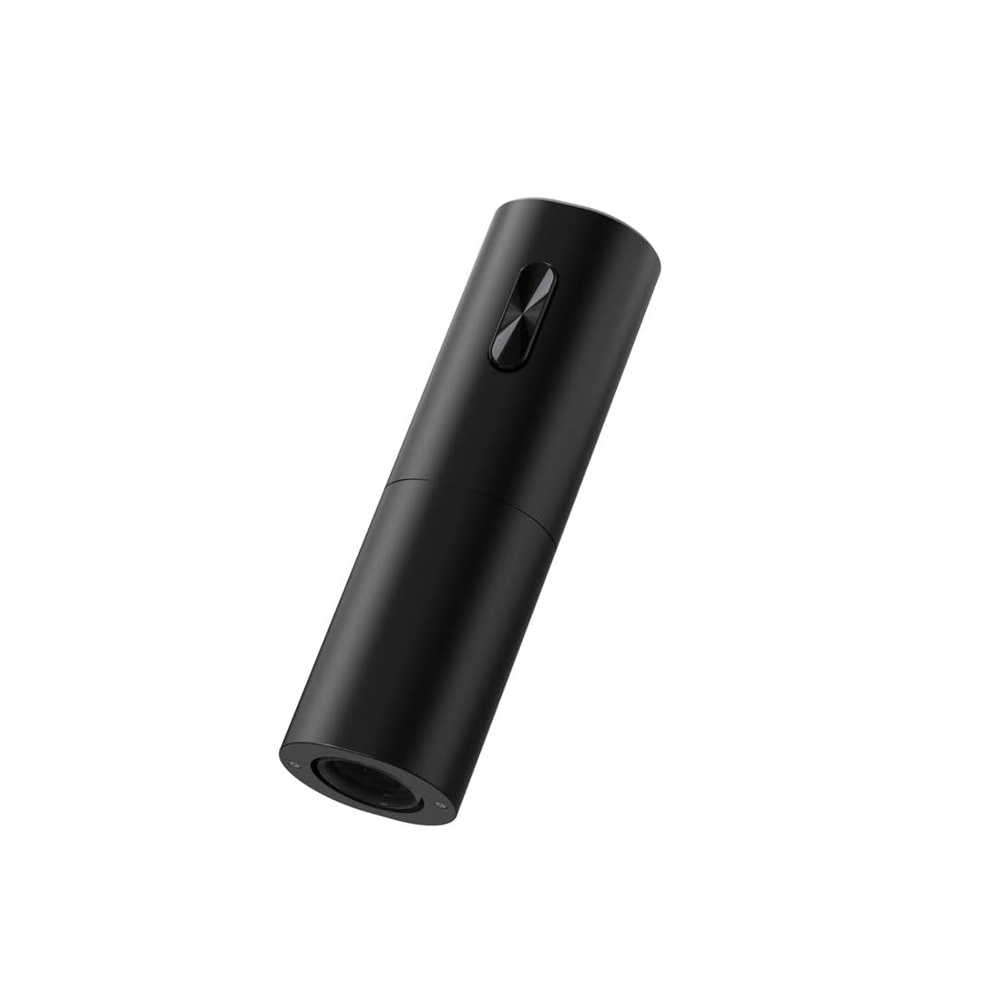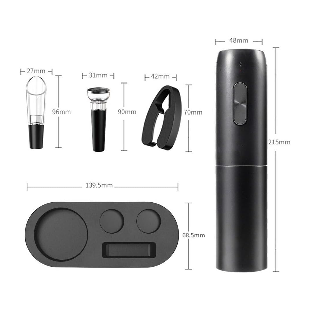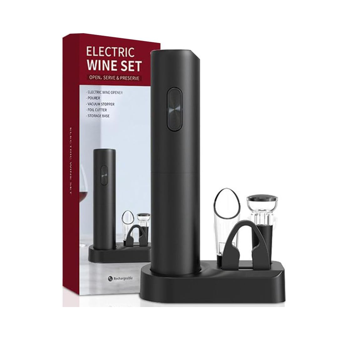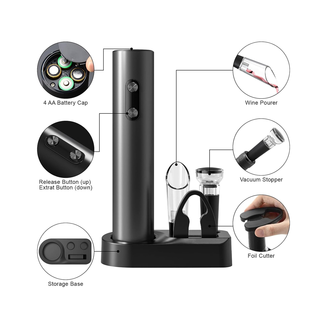 Battery-operated electric wine opener set with aluminum cutter, vacuum stopper, pourer, and storage base.